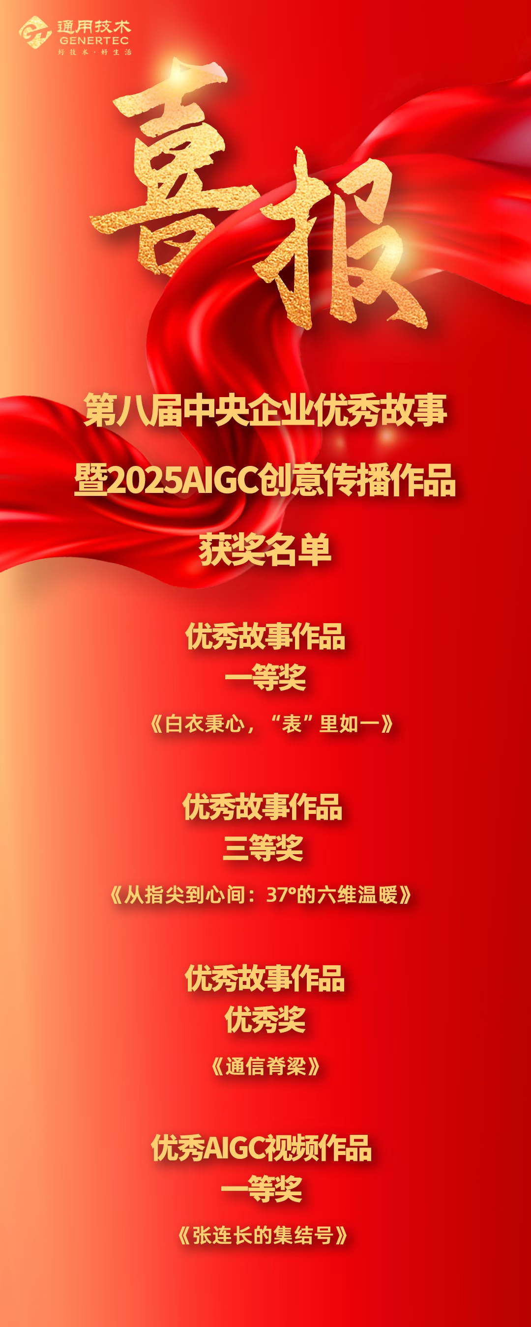 12月10日,由國務院國資委宣傳局、中國外文局、人民網聯合主辦的第八屆中央企業優秀故事暨2025AIGC創意傳播作品發布展示活動在北京舉行?,F場發布優秀故事作品、優秀AIGC視頻作品、優秀AI+IP形象應用案例等多類榮譽,通用技術集團選送的4部品牌傳播作品獲獎。